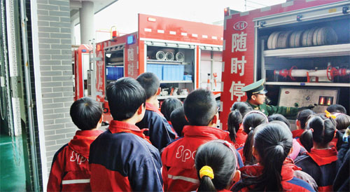 同學們在官兵的帶領下,參觀了車庫及車輛器材、榮譽室、寢室等庫室。當大家看到整齊排列的各類消防車時,激動的心情難以抑制,紛紛圍著消防車看看這個、摸摸那個,愛不釋手。眼花繚亂的各類消防器材、裝備令同學們大開眼界。孩子們不時提出各種問題,官兵都一一作了解答,滿足了大家的好奇心。隨后,官兵還為大家演示了原地穿著戰(zhàn)斗服,面對難得的機會,孩子們躍躍欲試。幾位小朋友在官兵的幫助下,身著消防戰(zhàn)斗服神氣十足??吹剿麄儙洑獾哪?,大家給予熱烈的掌聲。