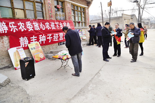 3月15日, 靜樂縣農(nóng)委工作人員深入該縣五家莊村、 木瓜山村、 溝口村開展 “放心農(nóng)資下鄉(xiāng)進(jìn)村” 宣傳活動(dòng)。此次活動(dòng)共向群眾發(fā)放 《購種提示》 、 《歡迎使用12316農(nóng)資打假投訴舉報(bào)電話》 、 《高毒和禁用農(nóng)藥清單》 、 《種子法》 摘要等宣傳資料3000余份。(閆曉梅 攝)