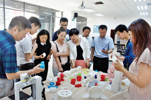 6 月1 日上午,市科技局對(duì)我市的兩個(gè)眾創(chuàng)空間進(jìn)行掛牌。目前我市已建成7 家眾創(chuàng)空間,搭建了廣闊的平臺(tái),鼓勵(lì)大學(xué)生創(chuàng)業(yè)。圖為市科技局和忻府區(qū)科技局的領(lǐng)導(dǎo)以及新聞媒體人員在大學(xué)生創(chuàng)業(yè)園區(qū)的眾創(chuàng)空間參觀3D打印。(楊峻峰 攝)