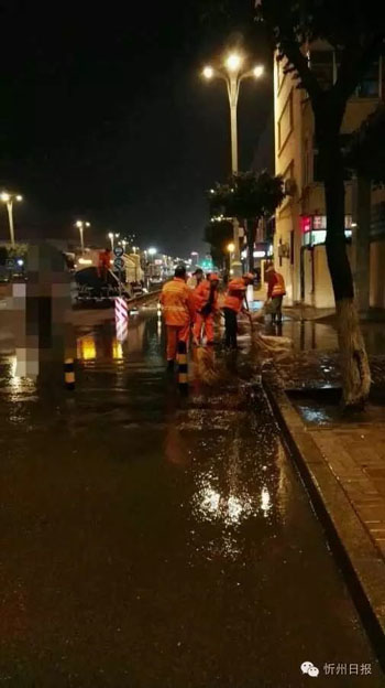 《創(chuàng)衛(wèi)先鋒》,街頭的環(huán)衛(wèi)工人冒雨工作,大雨中最美麗的身影。(班博然 攝)