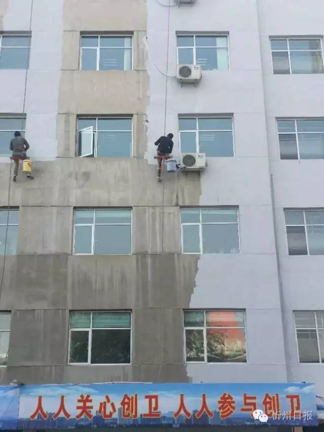 〝蜘蛛俠〞為城市換靚裝。10月28日,兩名工人在忻州城區(qū)忻師西巷接待處宿舍區(qū)高空作業(yè)為樓房粉刷涂料。(魯明強(qiáng) 攝)