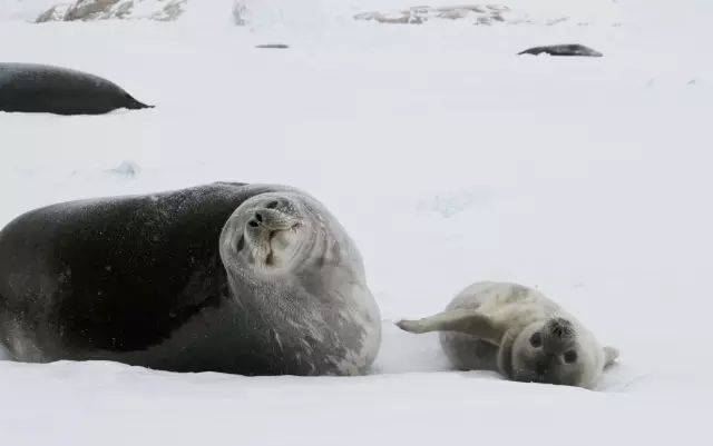 你們要的小海豹來了!這大眼睛,自帶美瞳效果。嗯,海豹媽媽在賣萌,小家伙在耍賴——這畫風,我給滿分!