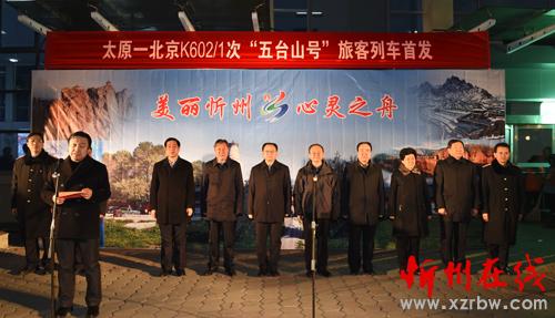 本報(bào)訊(記者 楊峰雷)1月11日晚23時(shí)20分,車廂標(biāo)有“美麗忻州心靈之舟”及五臺山標(biāo)志性古建大白塔圖案、由太原開往北京的K602次列車緩緩駛?cè)胄弥菡荆@標(biāo)志著“五臺山號”列車正式開行。開行首發(fā)儀式在忻州火車站站臺舉行,市委書記李俊明下達(dá)開行指令,市長鄭連生、太原鐵路局副局長劉楓分別致辭。市人大常委會主任賈雪峰,市政協(xié)主席劉鋼柱,市委常委、宣傳部長、統(tǒng)戰(zhàn)部長陳義青,市委常委、秘書長崔建新出席儀式。市委常委、常務(wù)副市長趙志堅(jiān)主持。