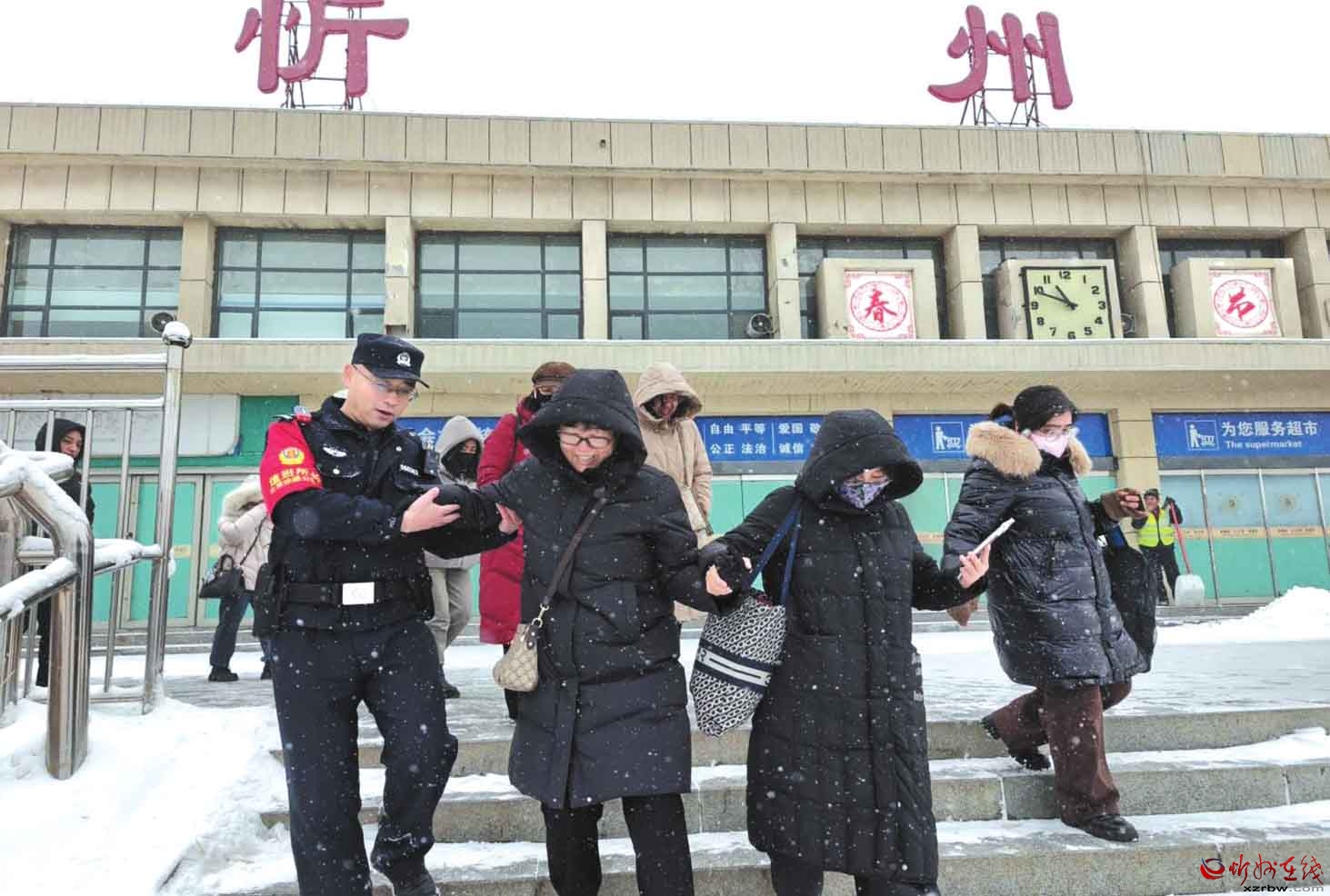 2月9日,忻州突降大雪,忻州站派出所干部民警全員堅守崗位,在站前廣場、進站口等重點區(qū)域巡邏防控值守執(zhí)勤。民警主動攙扶旅客、提醒注意防滑,及時幫扶行李較多的乘客,排查整治安全隱患,用實際行動踐行“人民公安為人民”的承諾,確保春運期間旅客出行平安。(于新梅攝