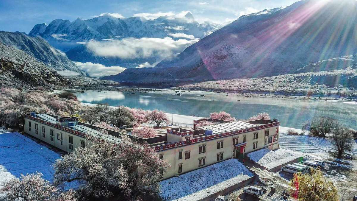 公尊德姆農(nóng)家樂位于林芝市米林縣派鎮(zhèn)雅魯藏布江大峽谷景區(qū),這里水連著山,山連著天,云霧沿著山坡緩緩傾瀉,仿佛為山川蒙上了一層白色面紗。