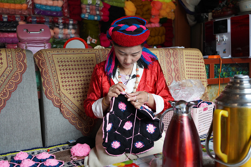 卓瑪正在家里用毛線(xiàn)編織著一對(duì)玫瑰花花色的抱枕套,這一對(duì)能賣(mài)400元。