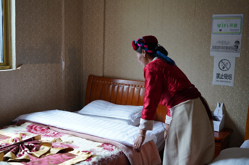 2015年,當(dāng)?shù)卣龀置考颐繎?hù)購(gòu)買(mǎi)了農(nóng)家樂(lè)設(shè)施設(shè)備,包括床、電視以及電視柜等?!拔疫@邊有8間房,可以住16個(gè)人。”卓瑪2015年開(kāi)始經(jīng)營(yíng)農(nóng)家樂(lè),一樓擺放著一些當(dāng)?shù)靥禺a(chǎn),偶爾還會(huì)給客人提供甜茶、蓋澆飯等。