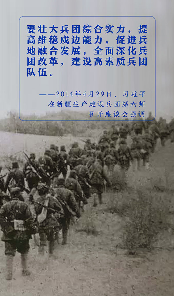 一代代各族兒女發(fā)揚(yáng)胡楊精神、兵團(tuán)精神,無(wú)畏艱險(xiǎn)、勇往直前、甘于奉獻(xiàn),奮力為建設(shè)一個(gè)團(tuán)結(jié)和諧、繁榮富裕、文明進(jìn)步、安居樂(lè)業(yè)的中國(guó)特色社會(huì)主義新疆作出貢獻(xiàn)。