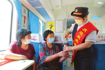 乘務(wù)員在蔡家崖號列車上為旅客提供服務(wù)。