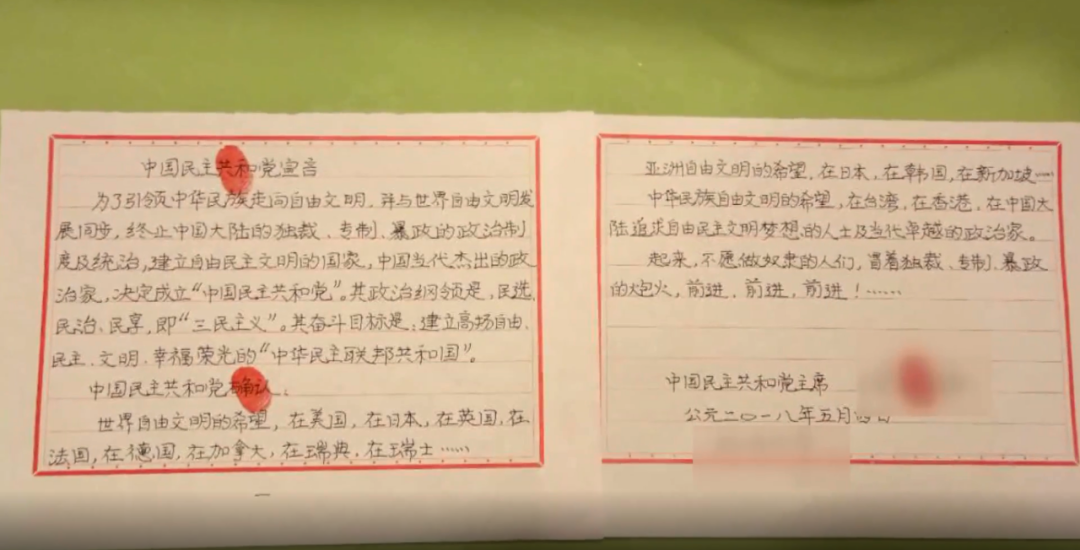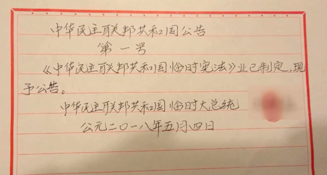 張某 2018年2月,張某認為自己年齡不小了,應該有所動作。 “我正式成為大總統(tǒng)!” 2018年4月底,張某向單位請假,以因私旅游的名義來到境外,準備在境外實施他的顛覆活動。 在境外落腳的酒店內(nèi),張某起草了他所謂的“建國綱領”和“建黨綱領”,隨后,在酒店房間內(nèi)舉行儀式,宣布成立“中國民主共和黨”和“中華民主聯(lián)邦共和國”,并宣誓出任“大總統(tǒng)”,頒布“總統(tǒng)一號令”。