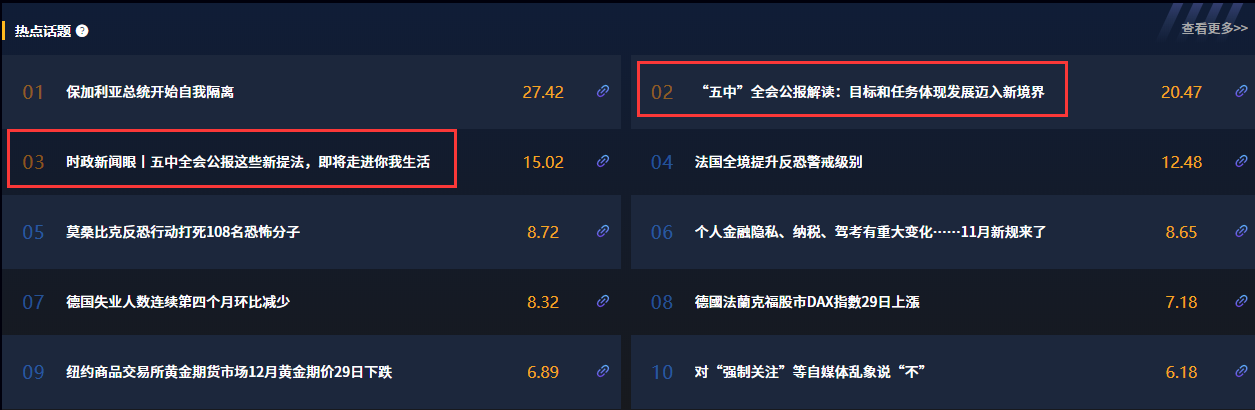 運用央視網(wǎng)“智聞”系統(tǒng)對30日全網(wǎng)新聞熱點進行抓取,在熱點話題一欄,全會公報相關(guān)報道穩(wěn)居話題榜前列,相關(guān)報道也引起廣大網(wǎng)友的熱議。