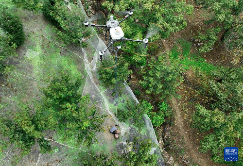 9月9日,在臨安島石鎮(zhèn)的一片山核桃林上方,農(nóng)用無人機將采收的山核桃運送出山(無人機照片)。(新華社記者 翁忻旸 攝)
