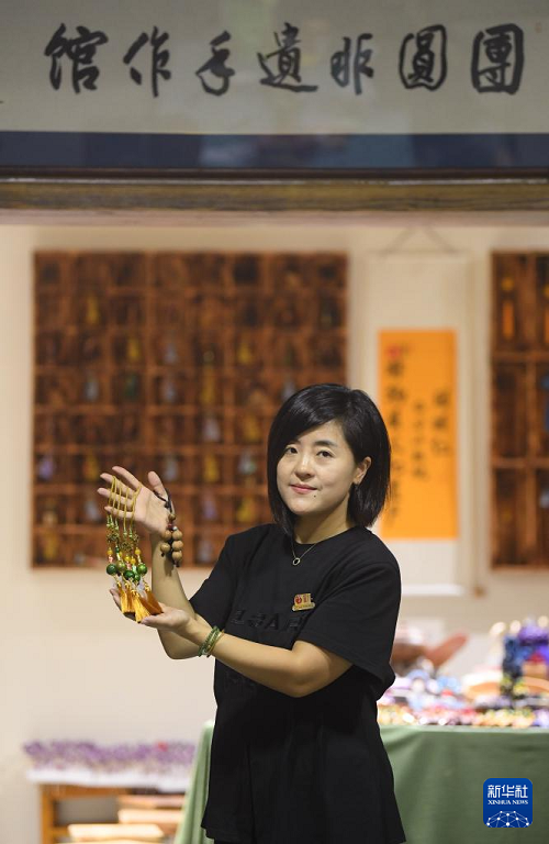 9月9日,在臨安龍崗鎮(zhèn)一家山核桃生產(chǎn)企業(yè),負責人陳潔展示利用山核桃空籽制作的文創(chuàng)產(chǎn)品。(新華社記者 翁忻旸 攝)