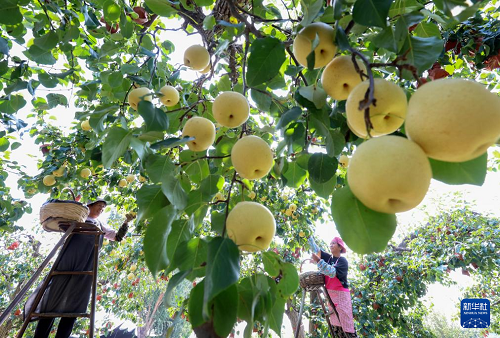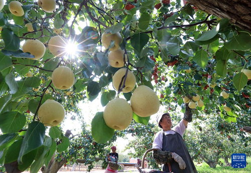 9月11日,河北省晉州市周家莊鄉(xiāng)第七生產(chǎn)隊(duì)農(nóng)民在梨園采收鴨梨。(新華社記者 楊世堯 攝)