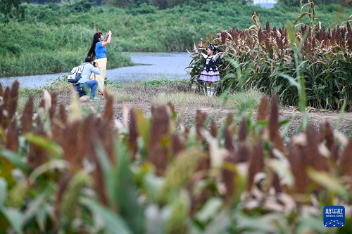 9月21日,游人在高粱地打卡拍照。(新華社記者 季春鵬 攝)