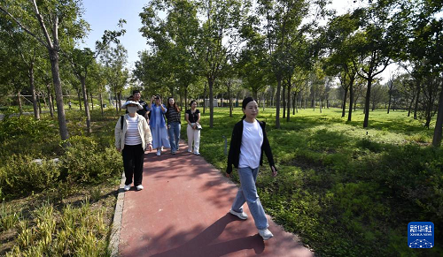 9月24日,市民在順義區(qū)后沙峪鎮(zhèn)的溫榆河公園內(nèi)的步道上運(yùn)動(dòng)。(新華社記者 李欣 攝)