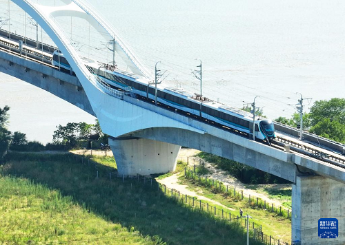 9月29日,列車駛?cè)霝I??炀€帝封江站(無人機照片)。(新華社記者 林善傳 攝)