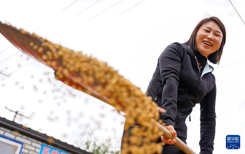 10月9日,韓鳳香在合作社內(nèi)晾曬剛收獲的大豆。(新華社記者 顏麟蘊(yùn) 攝)