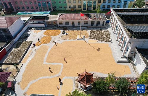 10月14日,農(nóng)戶(hù)在山東省臨沂市沂南縣蘇村鎮(zhèn)寶珠村廣場(chǎng)上晾曬糧食(無(wú)人機(jī)照片)。(新華社發(fā) 尹君 攝)