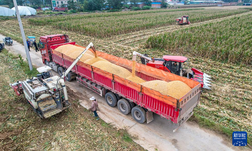 10月14日,在河南省商丘市夏邑縣會(huì)亭鎮(zhèn),收割機(jī)將收獲的玉米裝車(chē)(無(wú)人機(jī)照片)。(新華社發(fā) 王高超 攝)