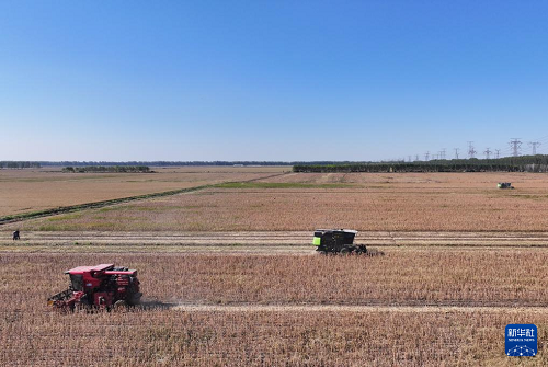 10月21日,收割機在天津市薊州區(qū)下窩頭鎮(zhèn)收獲大豆(無人機照片)。(新華社記者 李然 攝)