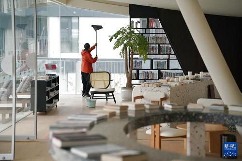 10月29日,在鎮(zhèn)坪縣牛頭店鎮(zhèn)國慶村,一家山居酒店工作人員在酒店書吧內打掃衛(wèi)生。(新華社記者 邵瑞 攝)