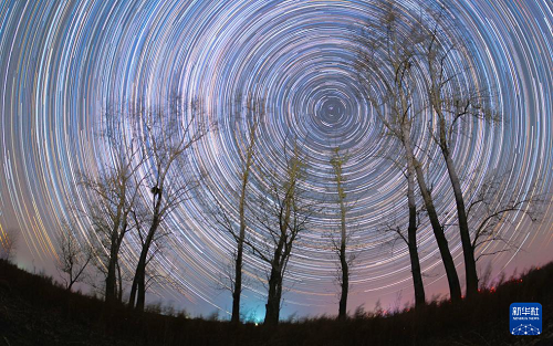 10月31日在黑龍江省富錦市拍攝的秋日星空下的秋樹(shù)(堆棧合成照片)。(新華社發(fā) 庚喜慶 攝)
