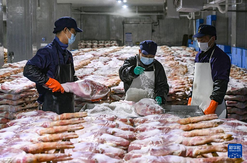 11月6日,在浙江省金華金年火腿有限公司車(chē)間內(nèi),技師在腌制火腿。(新華社發(fā) 時(shí)寬兵 攝)