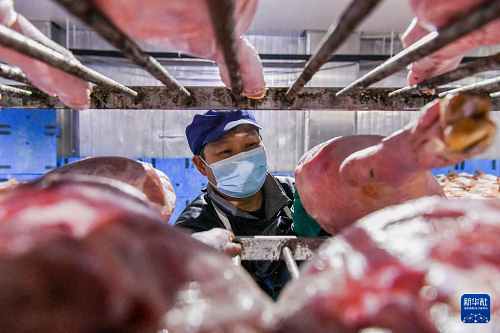 11月6日,在浙江省金華金年火腿有限公司車(chē)間內(nèi),技師查看腌制火腿的原料。(新華社發(fā) 時(shí)寬兵 攝)