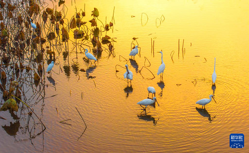 11月10日,鳥(niǎo)兒在江蘇興化里下河國(guó)家濕地公園內(nèi)棲息(無(wú)人機(jī)照片)。(新華社發(fā) 周社根 攝)