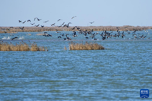 11月13日,山東黃河三角洲國家級自然保護區(qū)內,越冬候鳥在飛翔。(新華社記者 朱崢 攝)