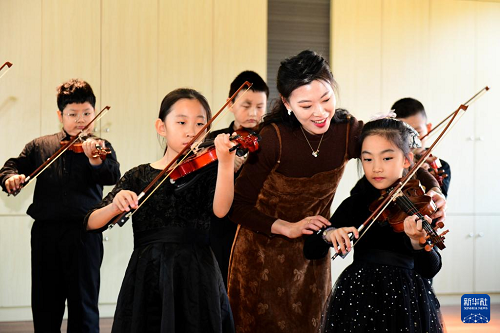 11月26日,在濟(jì)南市市中區(qū)泉海小學(xué),音樂老師夏霄霏在指導(dǎo)學(xué)生拉小提琴。(新華社記者 郭緒雷 攝)