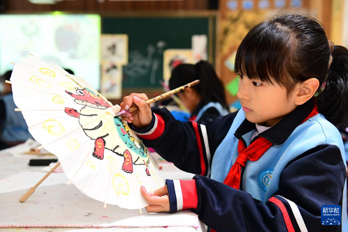 11月25日,在濟(jì)南市市中區(qū)愛都小學(xué),一庭香國(guó)畫社團(tuán)的學(xué)生在畫畫。(新華社記者 郭緒雷 攝)