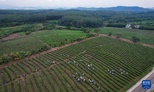 在海南省白沙黎族自治縣五里路茶園,學(xué)生在體驗(yàn)采茶(11月20日攝,無(wú)人機(jī)照片)。(新華社記者 楊冠宇 攝)