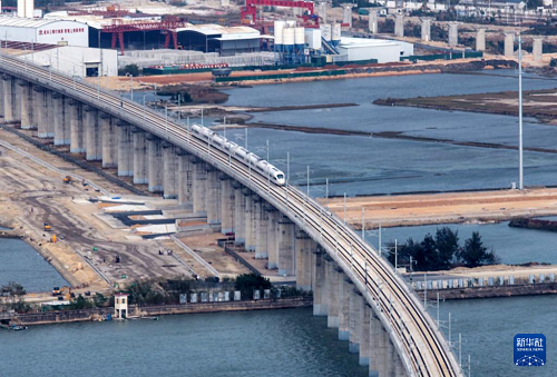 這是12月22日拍攝的行駛在汕頭濠江特大橋上的高鐵列車。(新華社發(fā) 姚軍 攝)
