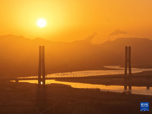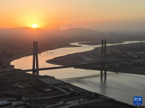 12月23日在日出時分拍攝的包銀高鐵烏海黃河特大橋。(新華社記者 邢廣利 攝)