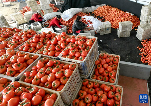 12月29日,肅寧縣萬(wàn)里鎮(zhèn)一家蔬菜種植合作社的社員將收獲的西紅柿卸車。(新華社記者 楊世堯 攝)
