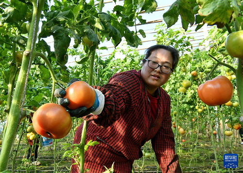 12月29日,肅寧縣萬(wàn)里鎮(zhèn)一家蔬菜種植合作社的社員在大棚內(nèi)采摘西紅柿。(新華社記者 楊世堯 攝)