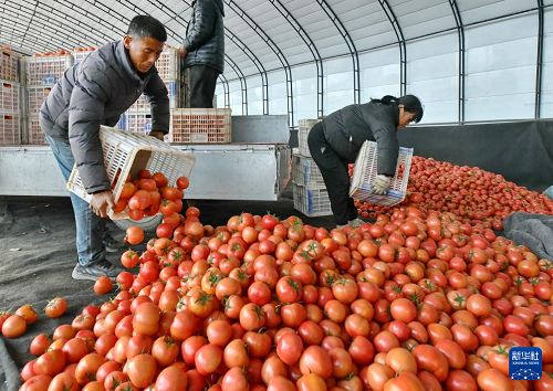12月29日,肅寧縣萬(wàn)里鎮(zhèn)一家蔬菜種植合作社的社員在分揀收獲的西紅柿。(新華社記者 楊世堯 攝)