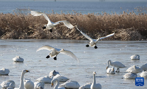 1月5日,大天鵝在榮成大天鵝國家級(jí)自然保護(hù)區(qū)棲息。(新華社記者 徐速繪 攝)