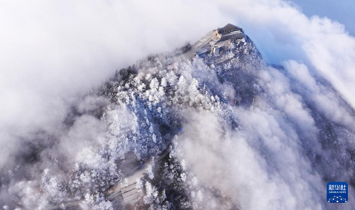 1月6日在南岳衡山風(fēng)景區(qū)拍攝的霧凇云海景觀(無人機(jī)照片)。(新華社發(fā) 曹正平 攝)