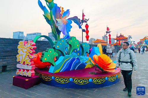 2026年1月4日,趙彬在西安城墻新年燈會(huì)期間帶著城墻外骨骼機(jī)器人巡查。新華社發(fā)