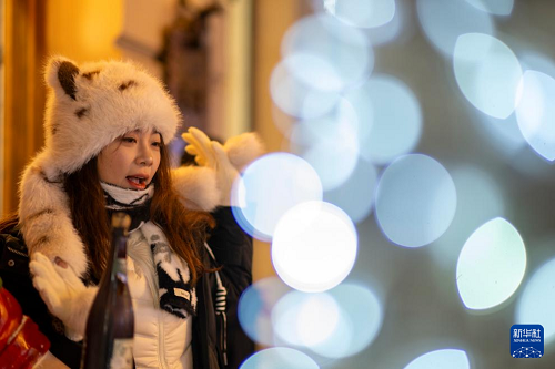 1月8日,游客在哈爾濱中央大街游玩拍照。(新華社記者 王建威 攝)