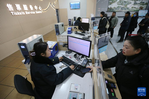 1月19日,南京南站工作人員在售票處為旅客辦理車(chē)票業(yè)務(wù)。(新華社發(fā) 蘇陽(yáng) 攝)