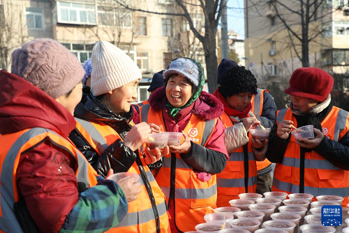 1月25日,在河北省唐山市豐潤(rùn)區(qū)燕山路街道欣園社區(qū),環(huán)衛(wèi)工人品嘗志愿者送來的臘八粥。(新華社發(fā) 朱大勇 攝)