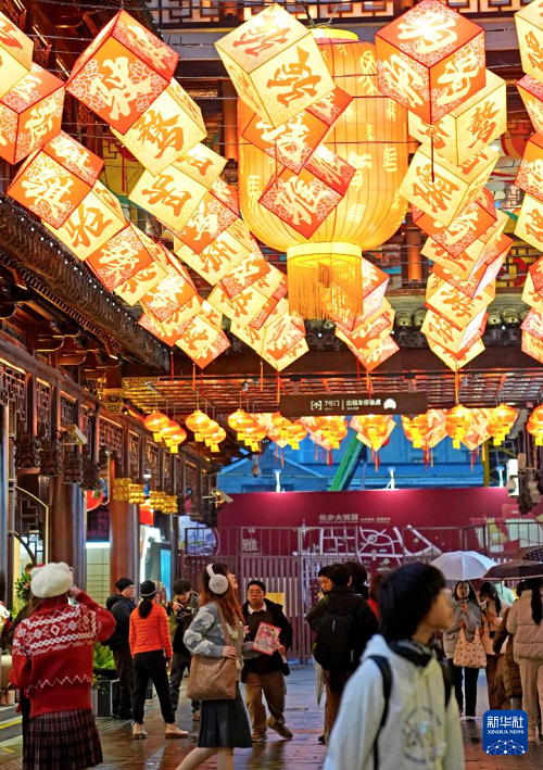 1月26日,豫園燈會(huì)上的春聯(lián)與流光溢彩的花燈營(yíng)造出新春的喜慶氛圍。(新華社記者 劉穎 攝)