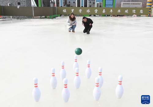1月28日,在北京市平谷區(qū)鎮(zhèn)羅營鎮(zhèn)湖畔耕讀園,游客在活動現(xiàn)場體驗“冰上保齡球”。(新華社記者 任超 攝)
