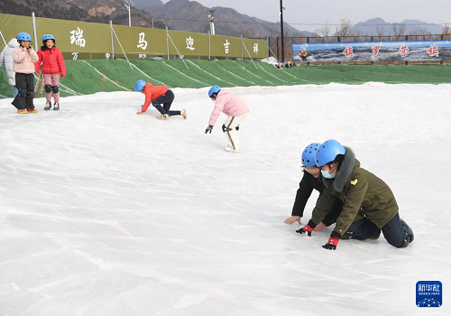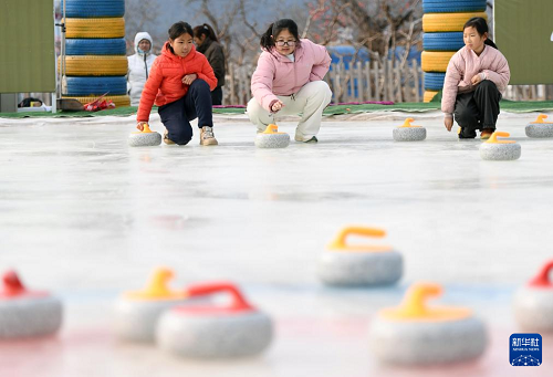 1月28日,在北京市平谷區(qū)鎮(zhèn)羅營鎮(zhèn)湖畔耕讀園,小朋友們在活動現(xiàn)場體驗冰壺。(新華社記者 任超 攝)