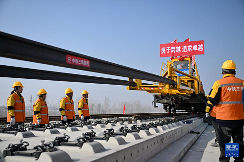 2月1日上午,在河北省保定市順平縣的雄忻高鐵建設(shè)現(xiàn)場,中鐵三局集團(tuán)施工人員將首對(duì)500米長鋼軌平穩(wěn)、精準(zhǔn)地鋪設(shè)在無砟道床上,標(biāo)志著雄忻高鐵正式進(jìn)入鋪軌施工階段。