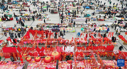 2月4日,在甘肅省臨夏回族自治州永靖縣劉家峽鎮(zhèn)年貨市場(chǎng),人們選購(gòu)年貨(無(wú)人機(jī)照片)。(新華社發(fā) 史有東 攝)